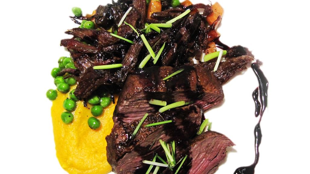 HÄRÄN SISÄFILETTÄ JA LAPAA, BATAATTIPYREETÄ JA PUNAVIINI-TIMJAMIKASTIKETTA