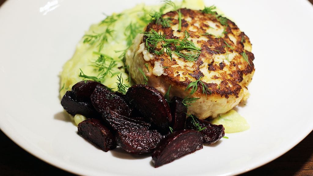 Hauki-katkarapupihvit tillisellä kananmuna-perunapyreellä ja punajuurella