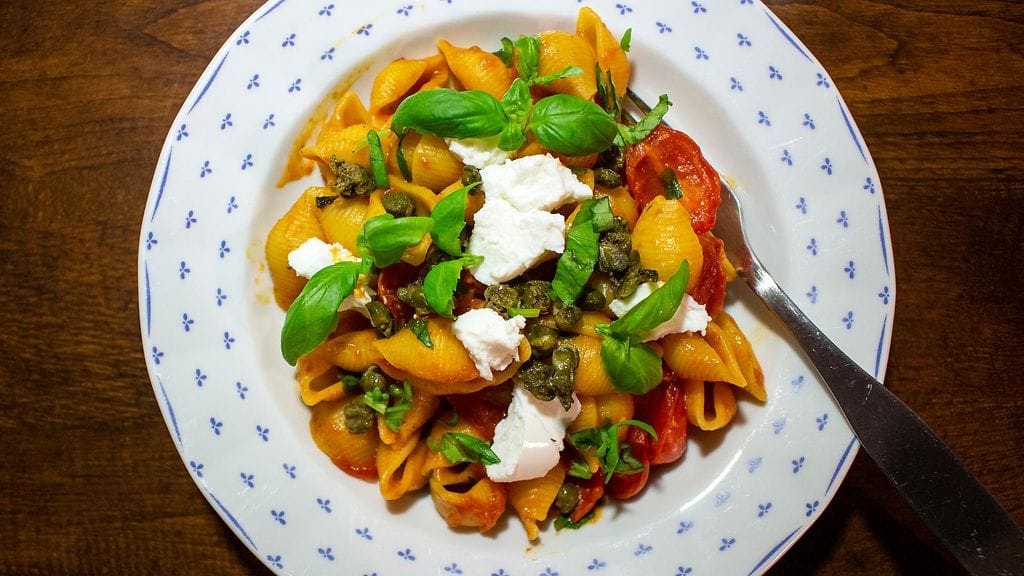 Tämän pastan hienous syntyy tuoreiden kirsikkatomaattien karamellisoimisen kautta saadulla syvyydestä, jolle chili tuo syvyyttä ja säpäkkyyttä sekä hauskoista, rapsakoiksi paistetuista kapriksista, jotka olivat tyyliltään uusi tuttavuus. Pienet nökäreet kermaista ricottaa pehmensivät kokonaisuutta mukavasti, kun taas parmesaani tai pecorino veisivät makua yhä syvempään päähän.