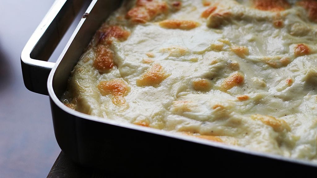 Kasaa lasagne. Voitele uunivuoka ja pohjalle ohut kerros béchamel-kastiketta, sitten lasagnelevy, kerros pinaatti-herkkusienitäytettä, kastiketta, lasagnelevy jne. Viimeinen kerros muodostuu kastikkeesta ja parmesaanista.