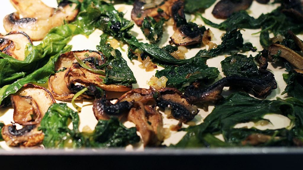 Tee béchamel-kastike valmiiksi. Hienonna sipuli ja kuullota oliiviöljyssä, kunnes se on läpikuultavaa. Lisää sienet ja timjami ja paista, kunnes sienissä on kaunis vaaleanruskea pinta. Lisää pesty ja ruodittu pinaatti pannulle ja odota kunnes se pehmenee (1-2 min). Lisää suola ja pippuri.