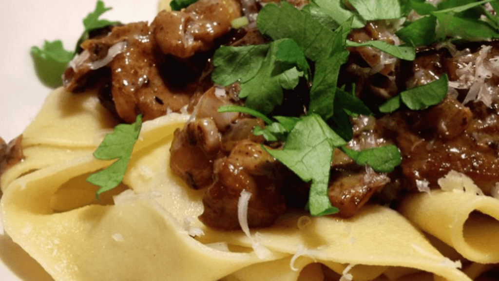 Tein pastan tähän itse, mutta keskitytään siihen nykertämiseen myöhemmin. Leveä pappardelle-pasta toimii tässä loistavasti, mutta kokeile myös tagliatellea tai farfallea. Tuorepasta, kaupan tai itsetehty, on tähän kuitenkin paras vaihtoehto.