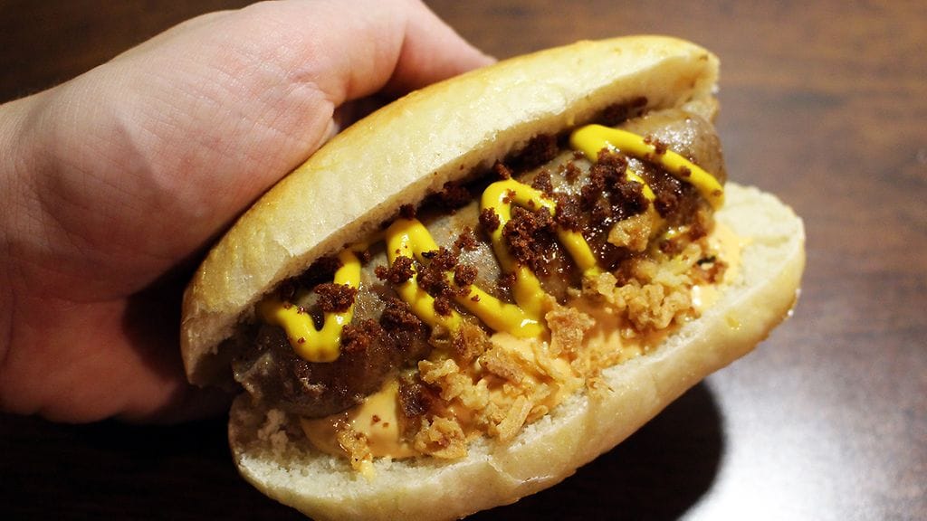 Kun veivasi vielä sämpylät itse, nousi snägäriklassikko uusiin ulottuvuuksiin. Olin aamulla nähnyt ruokadokumentissa kokin tekevän pekonilunta, joka sopisi varmasti myös tähän pisteeksi i:n päälle. Höysteeksi vielä jenkkisinappia, kuivattua sipulia ja itsetehtyä Sriracha-majoneesia ja täyden kympin katuruoka juhlisti kotikeittiön sunnuntai-iltaa.