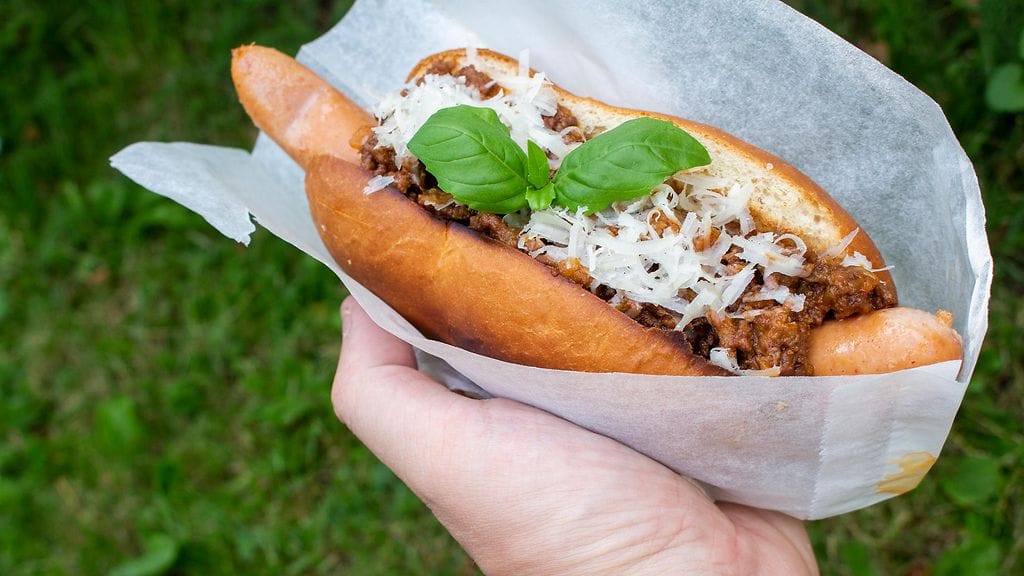 Täyteläinen hot dog täynnä pitkään hautuneen bolognese-soosin syvän hienostuneita makuja. Italialainen comfort kohtaa jenkki-street foodin. The best of two worlds. Tuli mieleen lihallinen Lobster Roll.