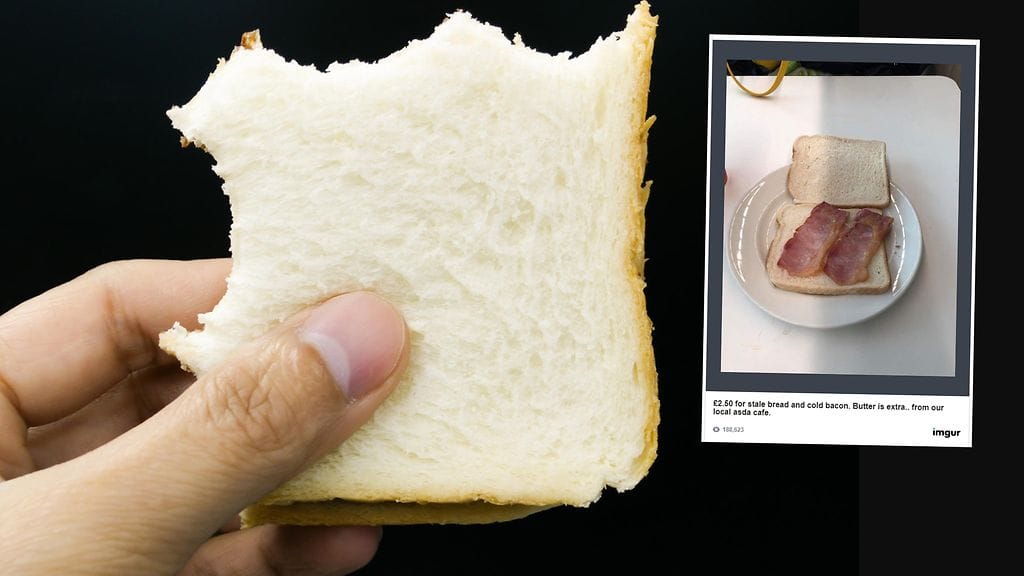 Reddit-käyttäjä TomskiGamesin julkaisema kuva aamupalaleivästä kertoo enemmän kuin tuhat sanaa. Kaksi ja puoli puntaa, eli lähemmäs kolme euroa maksanut leipä piti sisällään kaksi kuivaa leipäviipaletta, joiden välistä löytyi pari kylmää pekonisiivua.