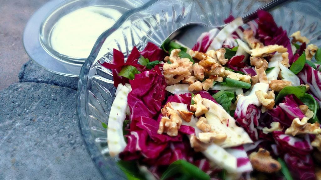 Halusin mukaan aromaattista ja tummaa sävyä. Kahvi ja kaakao sopivat siihen mainiosti. Savustettua paprikaa tuomaan lisää syvyyttä ja muita mausteita antamaan sävyjä. Tälle viinille pystyy iskemään vastaan kunnolla makua. Tuhtia tuhdin päälle. Toimii. Kunnon grillipihvin kylkeen paras vaihtoehto on ranskalaiset tai salaatti. Haluan täyttää lautasen mauilla ja toisiaan tukevilla elementeillä, joten tein salaatille kastikkeen, joka toimisi myös lihan kanssa. Sinihomejuustoinen kastike osoittautui hämmästyttävän monitoimiseksi ja se tulee olemaan vakiokalustoa dippinä, pihvisoosina sekä salaatin kera. Tästä tuli suoraan sanoen aivan killeri.