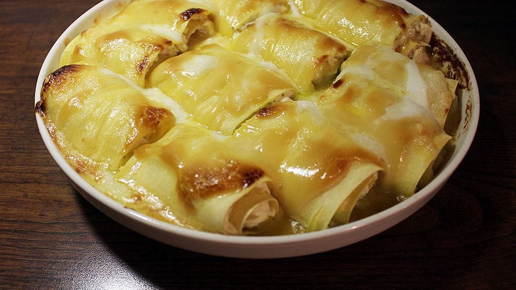 Olen napsinut Facebookin lyhyistä kokkausvideoista muutaman loistavan reseptin. Taas löytyi uusi. Alfredo-kastike on klassikko pastan kera. Simppeli soosi voista, kermasta ja parmesaanista ei voi olla kuin hyvä. Nyt mukaan vedetään vielä ricottaa ja mozzarellaa sekä revittyä kanaa. Seos kääräistään lasagnelevyn sisään ja paahdetaan kullankeltaiseksi. Todellinen juustonrakastajan ruoka! Supermaukas ja varsin tuhti makupala.