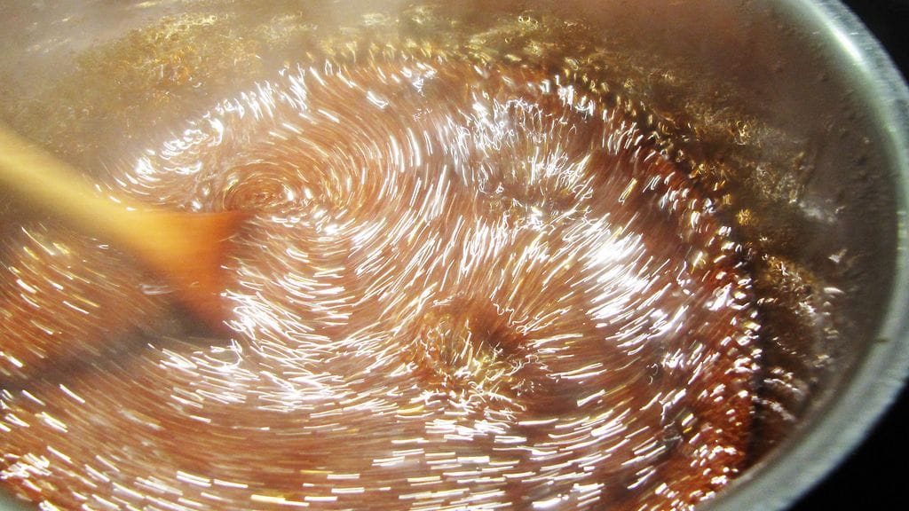 Tee karamelliseos. Kaada kattilaan palmusokeri ja vesi. Kuumenna hiljalleen, jotta sokeri alkaa sulaa. Kiehauta varovasti ja karamellisoi, kunnes seos alkaa tummua ja tuoksua paahtuneelta. Kaada varovasti sekaan haudutusliemi ja sekoita voimakkaasti. (Voit käyttää kattilankantta suojana, jos seos hiukan "räjähtää".) Keitä kasaan, kunnes kastike alkaa olla tuhtia karamellia, ei silti liisteriä.