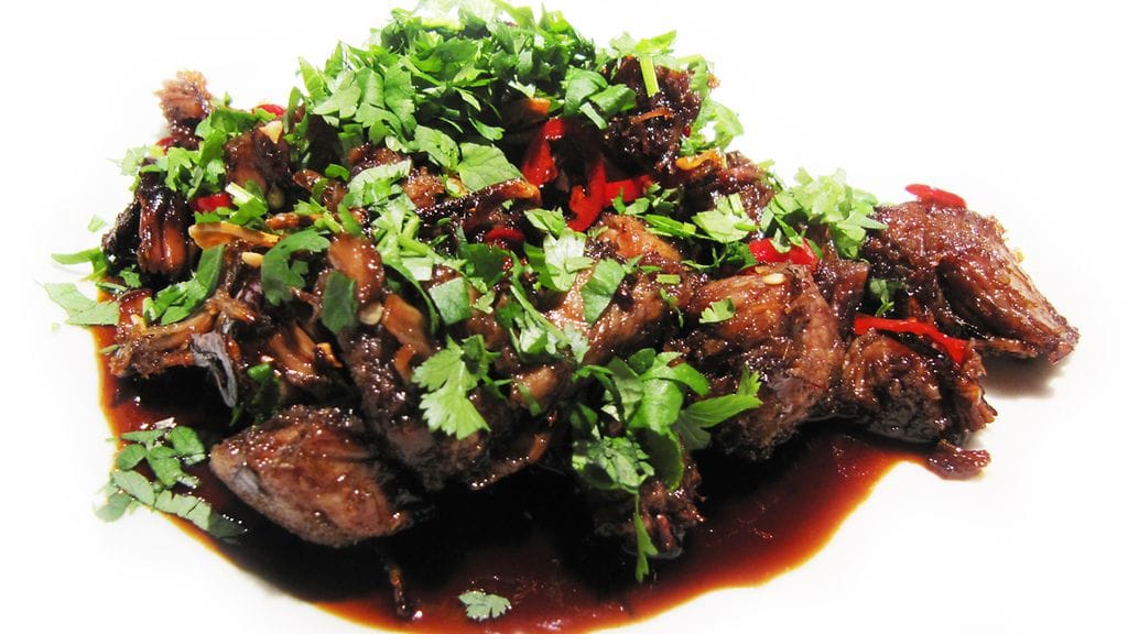 Valmistus aloitetaan jo edellisenä päivänä, mutta silloin täytyy liha laittaa vain hautumaan eli se ei ruuhkauta keittiötä tai arkiaskareita. Vaivannäkö palkitaan, trust me. Lue resepti ajatuksella ennen kuin alat hommiin. Siinä on muutama vaihe, mutta perusidea on yksinkertainen. Haudutetaan liha, tehdään kastike, friteerataan liha ja sekoitetaan kaikki yhteen.