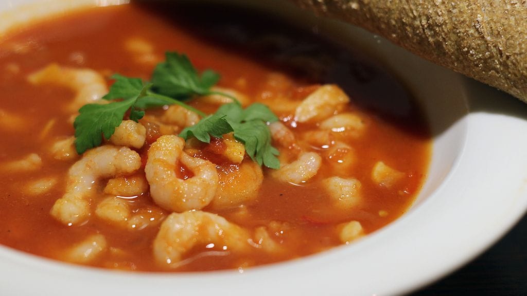 Kuumenna kattila keskilämmölle. Kuullota sipulia muutama minuutti ja lisää valkosipuli. Kuullota vielä minuutti. Sekoita mukaan tomaattipyree ja anna kypsyä minuutin verran. Kaada mukaan valkoviini ja anna poreilla pari minuuttia. Lisää kalaliemi, tomaattimurska, chili ja sokeri. Anna kiehahtaa varovasti. Laske lämpöä ja anna kevyesti poreilla 10 min. Lisää katkaravut ja anna niiden lämmetä. Älä keitä, etteivät mene kumiksi. Lisää sitruunamehu, suolaa ja pippuria. Maista ja mausta. Maussa tulisi maistua pieni chilin nostatus. Jos tarvii/haluat lisää tulisuutta, lorauta mukaan Srirachaa tai Tabascoa. Tarjoile patongin ja/tai riisin kera.