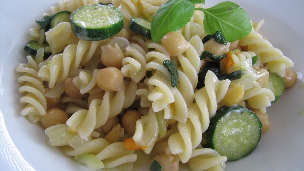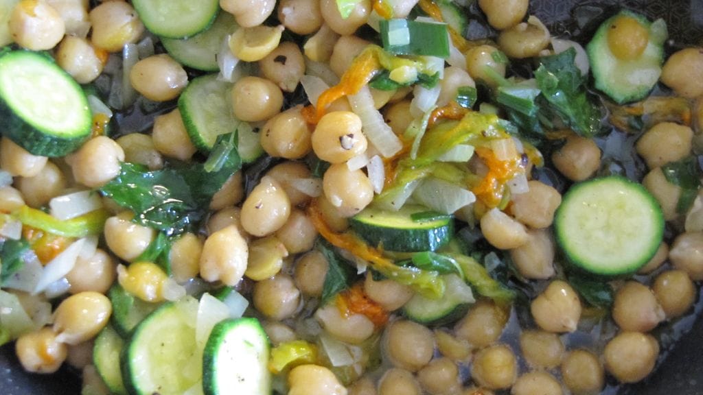 Tässä yksinkertainen, kesäinen pastaresepti, joka syntyi tohinan keskellä. Teet sen pastan kiehuessa. Jääkaappi oli tyhjillään, mutta puutarha riensi pelastamaan. Sävyä makuun antoi pihan tuottoisin yrtti, minttu. Laitoin mukaan myös hyllystä löytyneet kikherneet. Toimii mainiosti ilman niitäkin. Kesäkurpitsankukkia en ole nähnyt koskaan Suomessa myytävänä. Todella sääli. Ne ovat mainioita friteerattuina, täytettyinä sekä oivallisia värin ja maun antajia salaateissa ja pastoissa. Ne eivät ole tässä oleellisia, vaan kesäkurpitsan miedon lempeä maku.