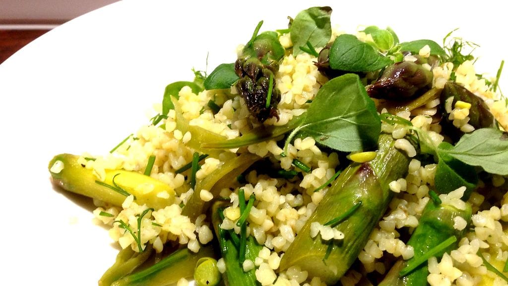 Kevään ykkösraaka-aineita minulle ovat parsa ja latva-artisokka. On ärsyttävää, miten paljon kokkailua tarvitaan, jotta pääsen maun hyvyydessä samaan, mitä yksinkertaisesti kypsennettynä molemmat edustavat. Sama pätee myöhemmin kesällä useaan sesongin kasvikseen. Tällä kertaa tein parsasta bulguri-pohjaisen ruoan, joka toimii niin lisukkeena, alkuruokana kuin pääruokanakin. Otin varaslähdön herneisiin ja lisäsin mukaan pilkottuja sokeriherneen palkoja. Yhdessä sitruunan kera annos on täynnä kevään raikkaita makuja. Nautitaan viileänä tai huoneenlämpöisenä.