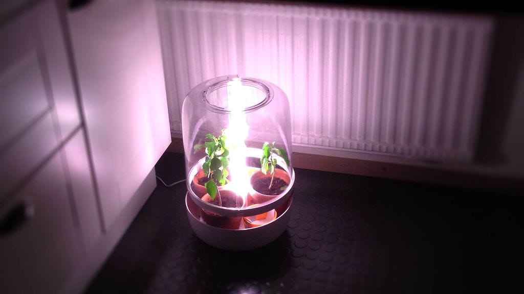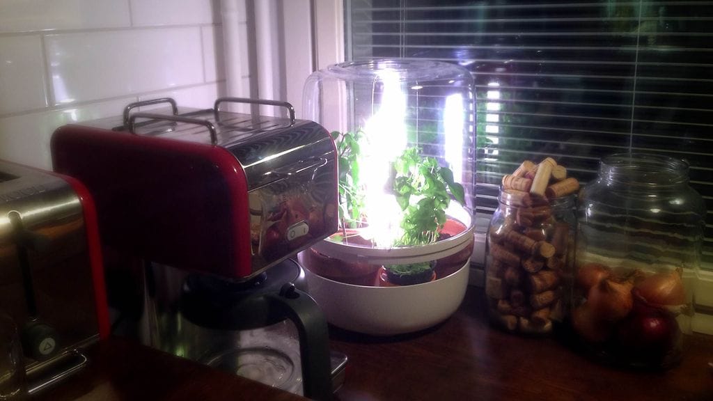Olin haaveillut jo pitkään yrttimasiinoista, mutta hinta ja pumpusta kuuluva meluhaitta olivat pitäneet meitä erossa. Kitchen Gardenissa ei kierrä vesi, joten laite on täysin hiljainen. Katselin huolestuneena pimeneviä iltoja ja helmikuussa kylvämiäni lyhyitä chilin varsia, jotka vain odottivat lakoamista pimeyden edessä. Koin sen edellisenä talvena vehreän chilipuskan kohdalla. Laitteen saavuttua kotiin, iskin chilit heti sisään. Ruukut olivat hiukan turhan suuret ja kupu jäi koholleen. Sillä ei ollut sen suurempaa merkitystä ja ajattelin etsiä sopivan kokoiset ruukut tilalle. Laitteen mukana tuli kaksi aihiota kaupan yrteille. Ne mahtuivat juuri hyvin mukaan kolmen chiliruukun kera. Chilien kastelu on kohtuullisen tarkkaa. Parhaimmillaan multa on koko ajan hiukan kosteana, ei koskaan kuivana eikä mielellään läpimärkänä. Melko helppoa hoivattavaa silti. Nuupahtaneet lehdet nousevat terhakkaana ylös parissa tunnissa kastelun jälkeen.