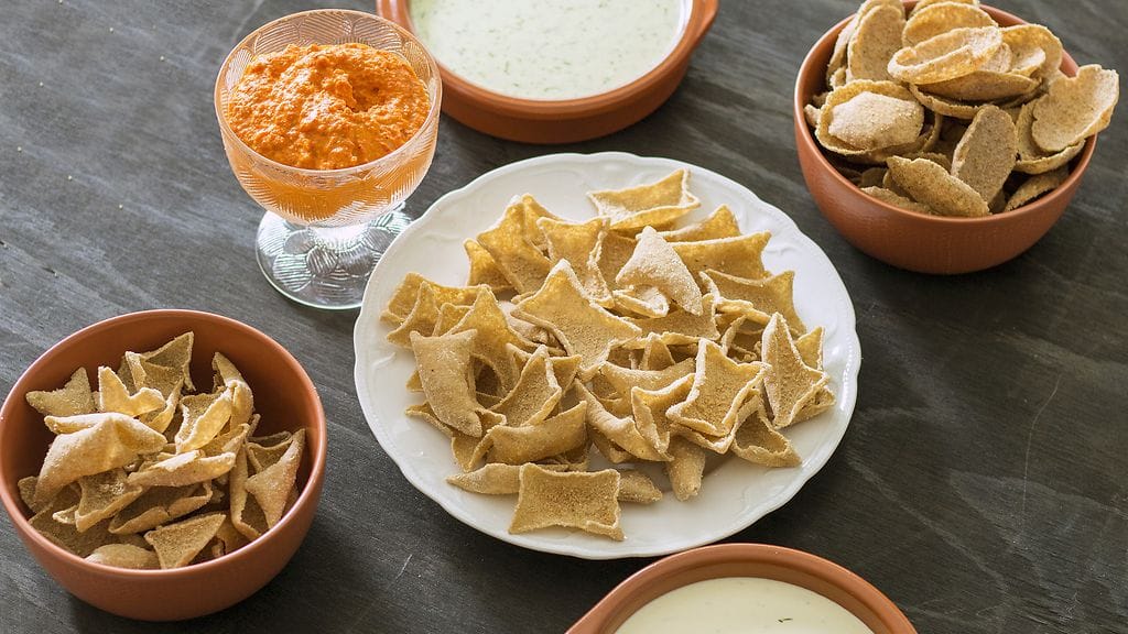 Sain päivätöiden kautta läjän Linkosuon erilaisia ruis- ja kaurasipsejä, joille piti keksiä höystettä. Sekoittelin kolme erilaista dippiä lauantai-illan leffojen äärelle. Kun tekee dipit itse, välttää turhat lisäaineet.