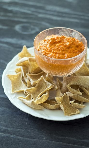 Hienonna mantelit tehosekoittimessa tai sauvasekoittimella. Surauta mukaan paprikat, sipulisilppu ja viinietikka. Anna koneen surrata ja kaada mukaan oliiviöljy. Maista ja mausta suolalla ja pippurilla.