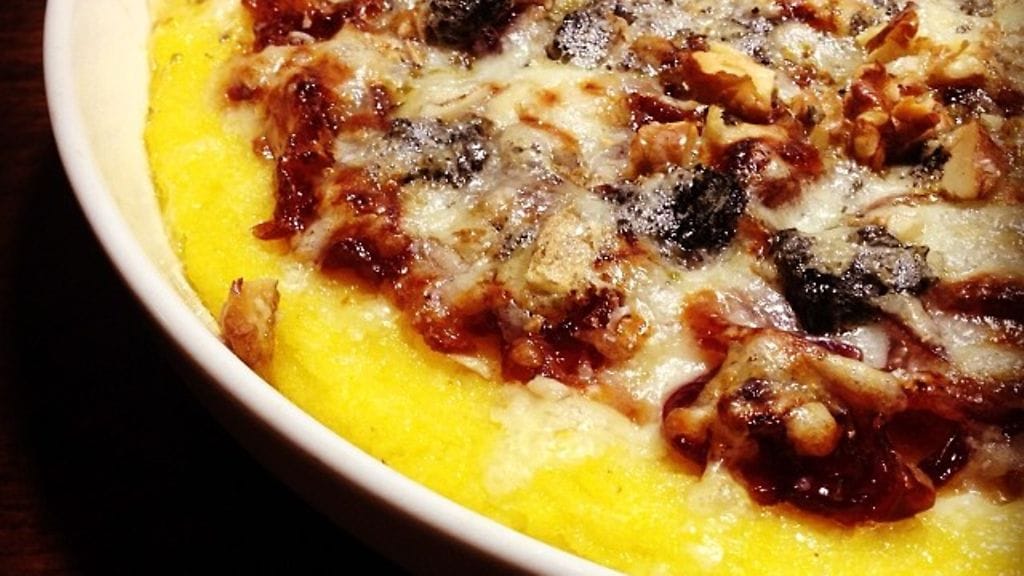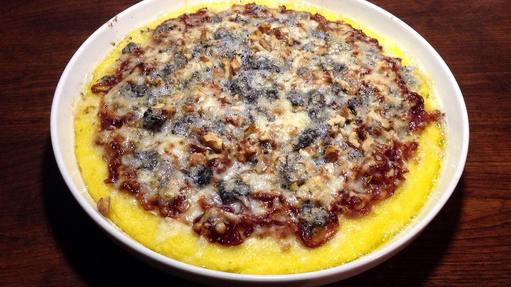 Olen tehnyt jos jonkinlaista pizzaa, mutta tällä kertaa ajattelin kokeilla jotain aivan uutta. Polentaa on kertynyt kaappeihin eri puolilta hämmentävän paljon. Kun kerran sitä voi grillata, niin miksei myös paistaa? Vaikka pizzapohjana. Täytteeksi suolaisen ja makean liitto. Karamellisoitua sipulia ja kolmea juustoa. Rakenteeksi ja syvyyttä lisäämään saksanpähkinöitä. Mitä mainioin lohturuoka syysiltaan tai vaikka pikkujouluihin.