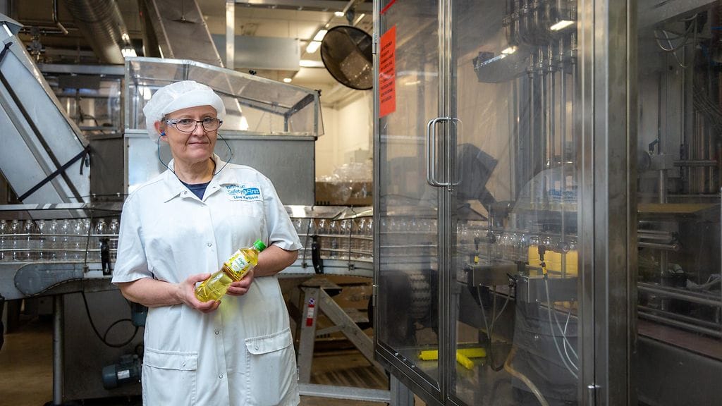 Kuvassa: Keiju-rypsiöljyä työntekijän kädessä Bungen tehtaalla.