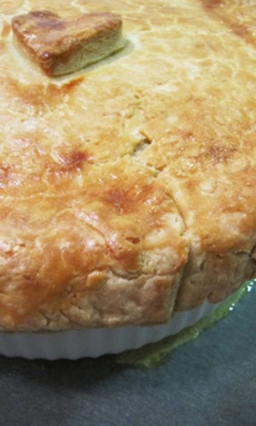 Kuumenna uuni 190 asteeseen. Ota taikina jääkaapista. Voitele voilla 3 litran vuoka, jonka syvyys on noin 5 cm. Levitä pohjalle puolet risotosta. Kaada päälle puolet kanatäytteestä. Ja sitten loput risotosta ja päälle loput kanatäytteestä. Kauli taikina kevyesti jauhotetulla alustalla hiukan vuokaa isommaksi levyksi. Nosta levy vuoan päälle ja painele reunoilta kiinni. Siisti reunat veitsellä. Voit koristella pinnan rippeillä mieleiseksi. Voitele kuori munalla ja paista uunissa 35-45 minuuttia, kunnes pinta on kauniin kullanruskea. Anna hetki vetäytyä ja tarjoa vaikka salaatin tai kasvisten kanssa.