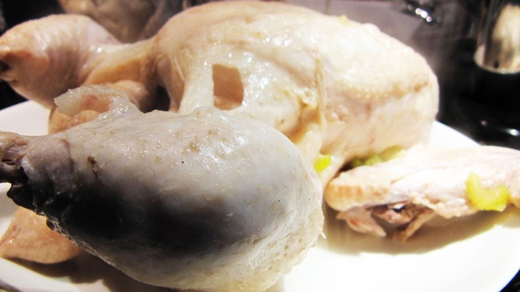 Valmista kana. Ota iso kattila ja laita kana sinne. Kaada päälle kylmää vettä sen verran, että kana peittyy. Lisää neilikat, laakerinlehdet, selleri, mustapippurit ja suolaa. Kuumenna kiehuvaksi ja anna hautua 1 h tai kunnes kana on läpikypsää. Kanan kiehuessa, kaavi pinnalle kerääntyvä vaahto pois. Nosta kypsä kana pois kattilasta jäähtymään. Anna nesteen kiehua vielä kasaan 30 min. Siivilöi ja ota talteen. Kun kana on jäähtynyt, kuori nahka pois ja revi lihat irti luista. Pilko syötävän kokoisiksi palasiksi ja laita jääkaappiin talteen käyttöä varten.