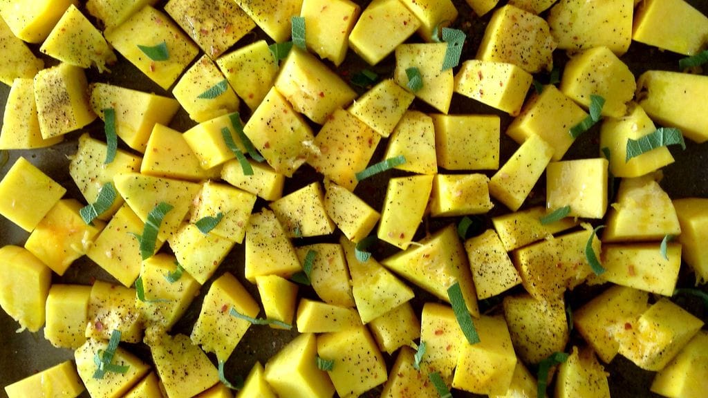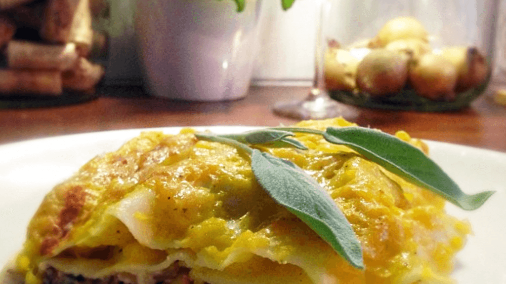 Syksyinen lasagne kurpitsan, sienten ja pähkinöiden kera saa kruununsa puhdaspiirteisen Chardonnayn käsittelyssä.