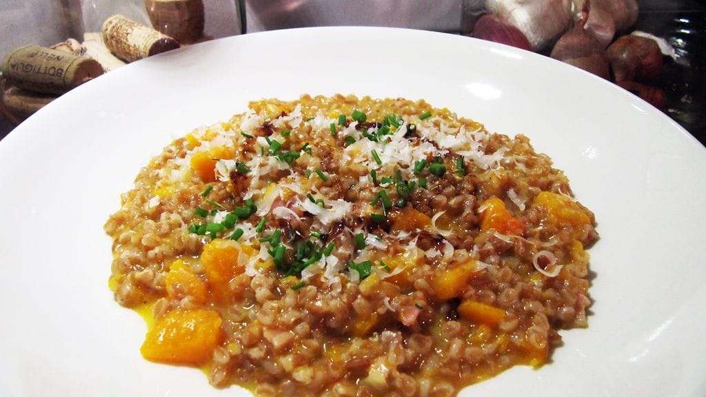 Butternut squashia eli myskikurpitsaa on alkanut saada parin vuoden aikana varsin usein hyvin varustetuista ruokakaupoista. Ruoka toimii perinteisellä talvikurpitsallakin. Käytin hiukan pekonia "mausteena" kuten Italiassa sanotaan. Toimii mainiosti täysin kasvisruokanakin. Viljana käytin riisin sijaan kotimaista emmervehnää. Makuun saa hienoa lisäsyvyyttä pienellä lorauksella balsamiviinietikkaa.