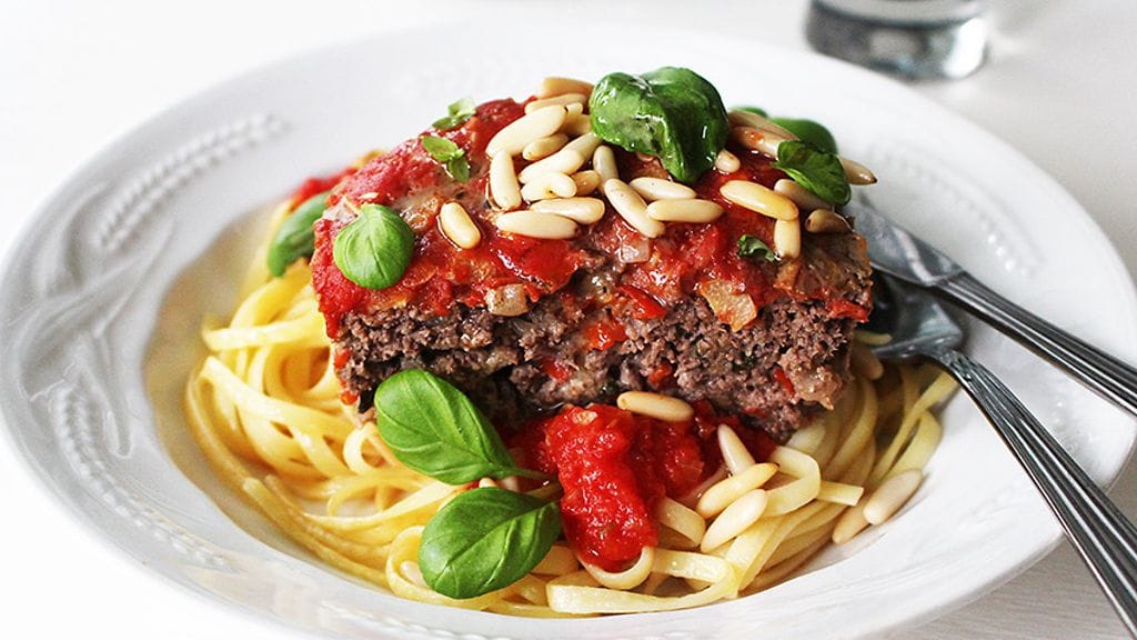 Nyt ruokaidea lähti raaka-aineesta. Meillä oli vajaa kilo sulaa hirven jauhelihaa. Lihapullia en halunnut tehdä. Mieleen tuli lihamureke, mutta siihen jokin juju. Mureke on periaatteessa vain iso, uunissa kypsennetty lihapulla, joten kaikki, mikä toimii pullissa, luulisi toimivan murekkeessakin. Siispä viedään lihapötkylää italaiseen makumaailmaan. Murekkeen päälle kaadetaan tomaattikastike, mikä mehevöittää lihaa ja toimi erityisen hyvin vähärasvaisen hirvenlihan kanssa.