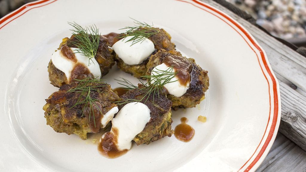 Kuivattu aprikoosi tuo näihin palleroihin hedelmällistä syvyyttä, jolle fenkolisiemenet tuovat hienoa sävyä. Lampaan jauheliha maistuu maanläheisemmältä kuin nauta tai possu ja komppaa muutenkin mielestäni paremmin aprikoosin kera. Lisää sävyjä tuodaan lorauttamalla päälle jogurttia sekä tamarindikastiketta.