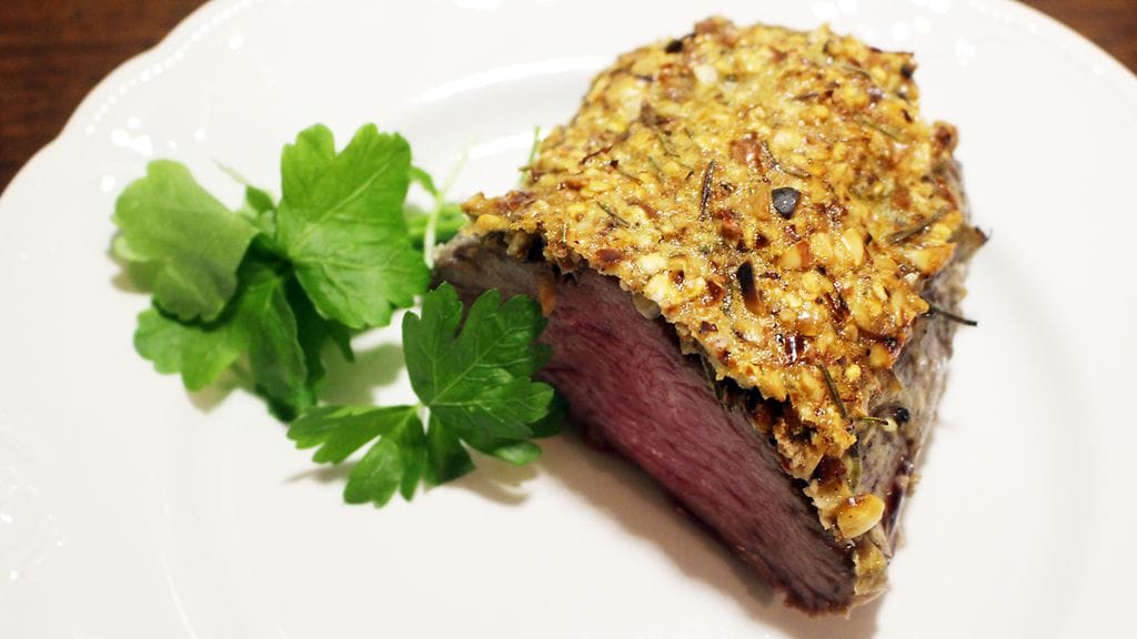 Ota liha huoneenlämpöön. Laita uuni lämpenemään 200 asteeseen. Tee kuorrute. Sekoita yhteen rosmariini, pähkinärouhe, chilirouhe ja kevyesti vatkattu kananmuna. Mausta suolalla ja pippurilla.