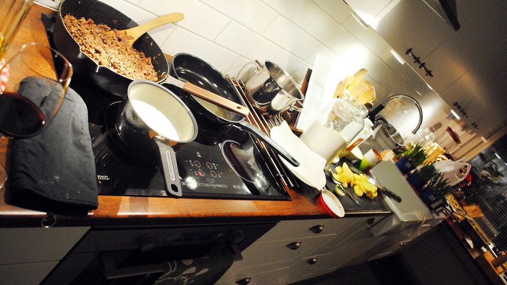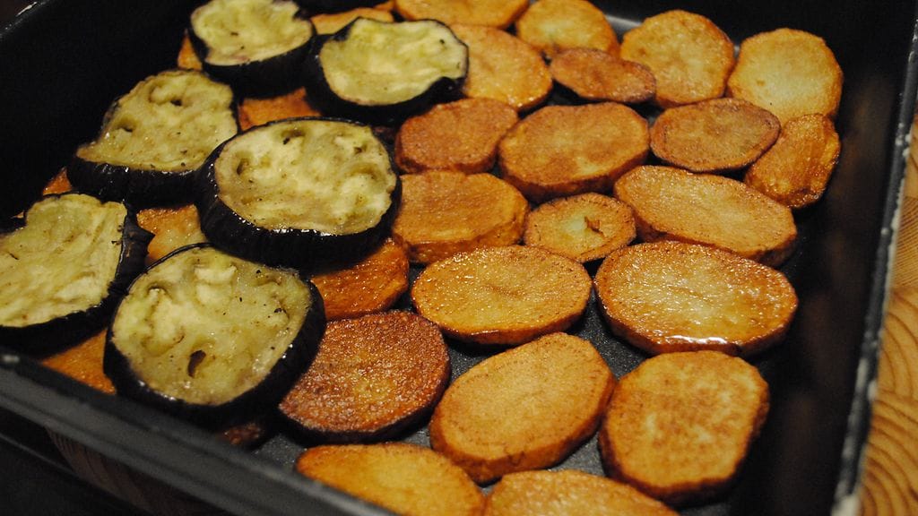 Ihastuin moussakaan kuusi vuotta sitten ollessani viikon purjehtimassa (kansipoikana) Kreikan saaristossa. Otimme aluksi tavoitteeksi löytää paras souvlaki. Kun tajusimme, että lihavartaat tehdään kotimaassaan varsin huonosta ja usein sitkeästä lihasta, vaihdoimme teeman moussakaan. Mainio päätös! Puolentusinaa annosta antoivat ruokalajille perspektiiviä ja variaatioita löytyi niin montaa kuin tekijääkin. Toiset oli tehty perunan kera, toiset ilman. Kotiin tultuani halusin heti kokeilla etelänherkkua itse tehtynä. Vanhassa, 1,5 neliön keittiössä se muodostui varsin haastavaksi urakaksi. Ennen kokkailua kannattaa laskutasot tyhjätä mahdollisimman hyvin. Koska kaikki ainesosat tehdään ennen kokkaamista valmiiksi, löytyy lopussa keittiöstä jäähtymässä pellillinen munakoisoa, kolme talouspaperiarkillista kuivuvia perunaviipaleita, kulhollinen jauhelihaseosta, kattilallinen béchamel-kastiketta, pannullinen paprikaa, kasa parmesaaniraastetta ja tiskejä. Kannattaa hiukan siivota kokkailun lomassa, ettei tule vastaavaa kaaosta kuin minulla (kts. kuva alla). Paprikat ovat varmasti vielä parempia grillattuina ja kuorittuina, mutta kaiken hässäkän keskellä vain paistoin ne. Olennaista on, että kukin ainesosa maistuu itsekseenkin mahdollisimman hyvältä, joten maistele ja mausta! Kannattaa myös lukea ohjetta kokonaisuutena ja katsoa, mitä vaiheita voi tehdä yhtäaikaa.
