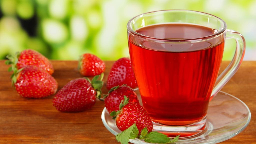 Soseuta 400 grammaa mansikoita hienoksi survokseksi. Voit notkistaa survosta tarvittaessa vedellä. Lisää mansikkasurvos hieman viilentyneen teen joukkoon siivilän läpi. Sekoita ja jätä jääkaappiin tekeytymään noin tunnin ajaksi.