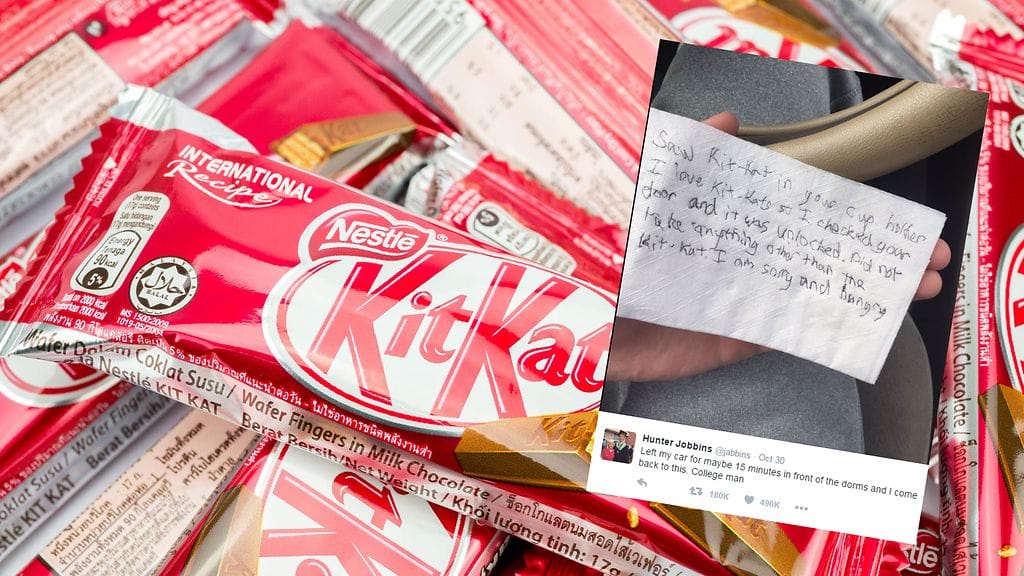 Yhdysvaltalainen Hunter Jobbins koki yllätyksen palatessaan takaisin autoonsa. Häneltä oli jäänyt auton ovet lukitsematta ja autosta oli varastettu vain siellä odottanut Kit Kat -suklaapatukka. Varas oli jättänyt myös autoon viestin.