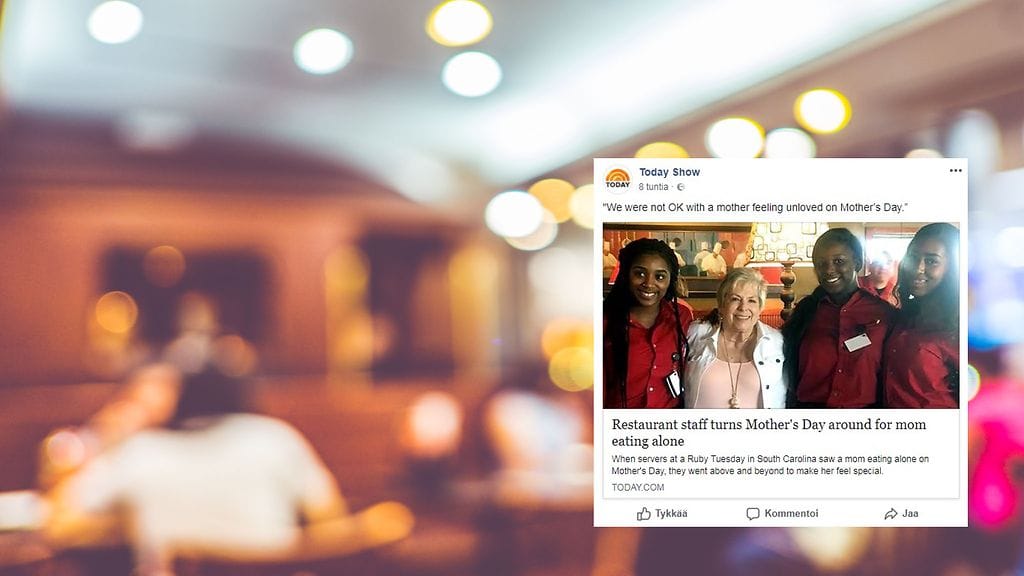 Etelä-Carolinassa sijaitsevan Ruby Tuesday -ravintolan työntekijät järjestivät yllätyksen äidille, joka oli lounastamassa yksin äitienpäivänä. Liikuttunut äiti otti vielä samana iltana yhteyttä poikaansa, jonka kanssa hän ei ollut puhunut useaan kuukauteen.
