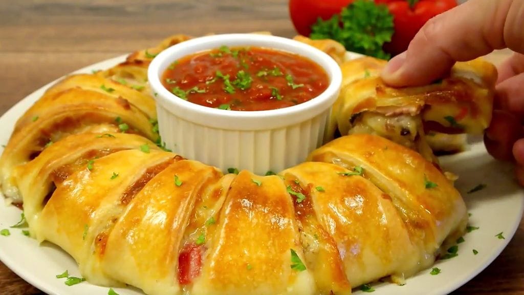 Munia voiteluunVoitele taiteltu ja täytetty pizzarinkula. Paista pizzarinkulaa uunissa 30 minuttia 190 asteessa. Leikkaa rinkulasta paloja ja dippaa tomaattikastikkeeseen.