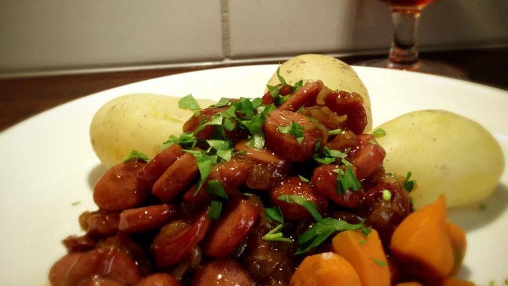 En ole kokkaillut oikeastaan mitään suomalaisia klassikkoruokia ellei yläasteen köksäntunteja lasketa. Tein vuodenvaihteessa listan ruokalupauksista. Niissä oli jostain syystä tai juurikin äsken mainituista syistä mukana nakkikastikkeen teko. Jääkaapissa oli hodari-iltamista jäljellejäänyt nakkipaketti, joka uhkasi mennä vanhaksi. 1+1 ja löysin itseni etsimästä nakkikastikkeen ohjeita. Mitä enemmän niitä luin, sitä vahvemman maun sain kuviteltua suuhuni. Tiedän tarkkaan, miltä nakkikastikkeen "kuuluu" maistua. En vain millään halunnut mielikuvitusmakua todeksi kielenpäälleni. Siispä googletin aihetta lisää ja löysin brittiläisen version, jossa oli jo jotain ideaa ja taatusti moninaisempaa makumaailmaa. Resepti on siis periaatteessa suomennos BBC:n sivuilta, mutta yleisön vaatimuksesta jaan sen teille. Se oli paras nakkisoosini, jota olen syönyt. Ei kuitenkaan kokin ansiosta. Kannattaa kokeilla vaihteeksi. Nautin soosia omasta maasta nostettujen pottujen kera.