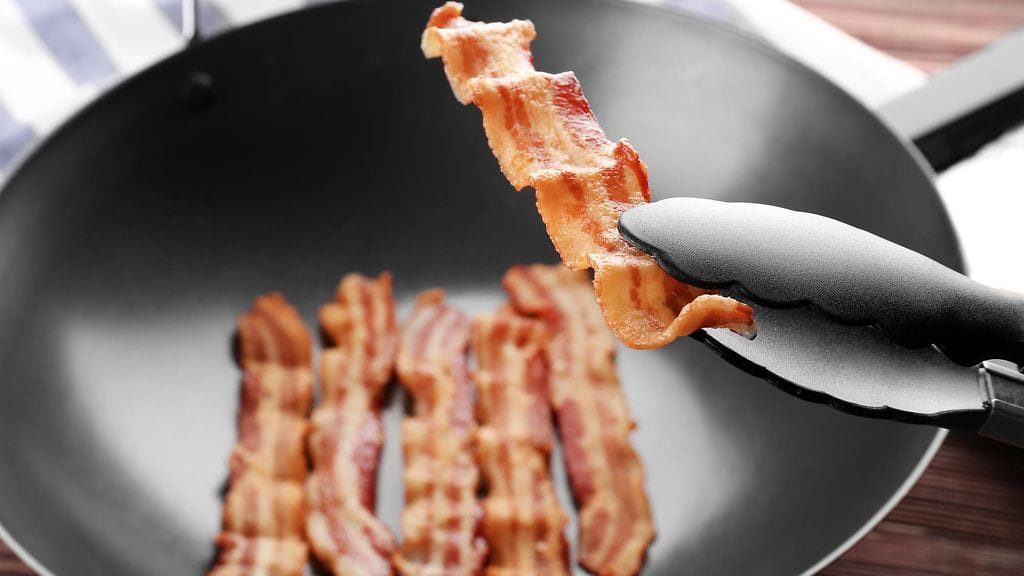 Pekonista tulee rapeampaa, jos pannulle lisää vettä. Samalla vältyt ikäviltä rasvaroiskeilta.
