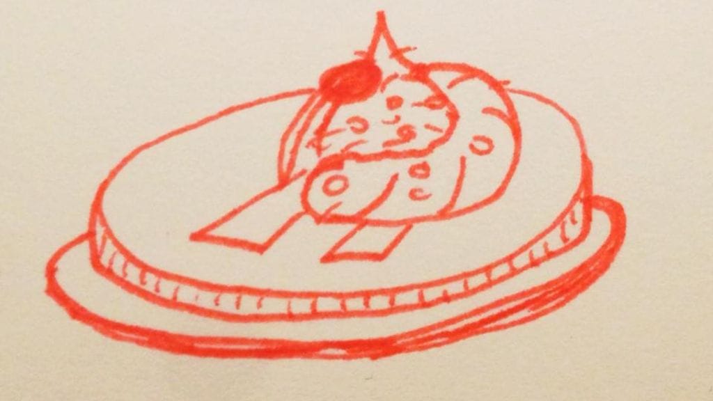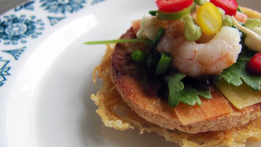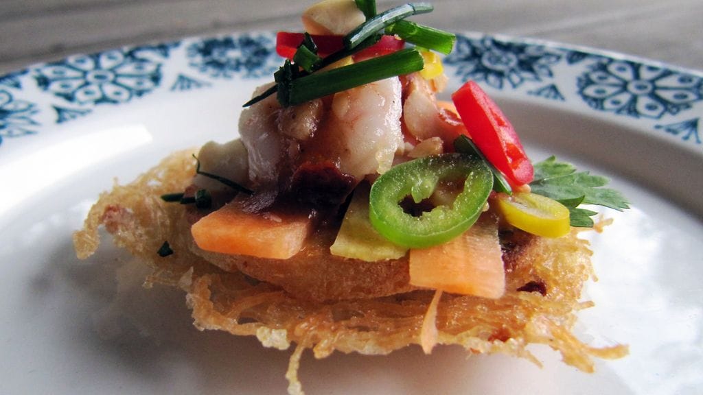 Halusin suunnitella annoksen, joka tiivistää katuruoan olemuksen yhteen tai kahteen suupalaan käyttäen tismalleen samoja aineksia kuin tekisin ruoan normaaliin, rustiikkiseen tapaan. Muutaman vaihtoehdon jälkeen keksin tavan tarjoilla Thaimaan kenties tunnetuin ruoka, ehta street food -klassikko, Pad Thai, herkullisena alku- tai cocktail-palana. Riisinuudelipohjainen wokki on se paras kalibrointiruoka, jolla mittaat thairavintolan tason. Ajattelin annoksen osaset erillään ja mietin, miten saisin ne puristettua yhdeksi sormin syötäväksi herkkupalaksi. Sitten välähti. Pohjaksi rapeaksi keksiksi paistettua riisinuudelia ja päälle loput osaset puhtaina makuina. Suunnittelin annoksen ensimmäistä kertaa piirtämällä hahmottaakseni kunkin osasen asettelua ja kokonaisuuden muodostamista. Piirroksesta tuli ulkopuolisin silmin katsottuna melko karmaiseva tai huvittava, mutta itse hahmotin sen kautta saman tien olevani oikeilla jäljillä (kts. kuva alla). Muistin kastikkeen olevan koostumukseltaan jämäkkää. Keskellä oleva nokare muuttuikin enemmän nestemäisen olomuodon myötä katkarapujen valeluksi ja pisaroiden ripotteluksi.