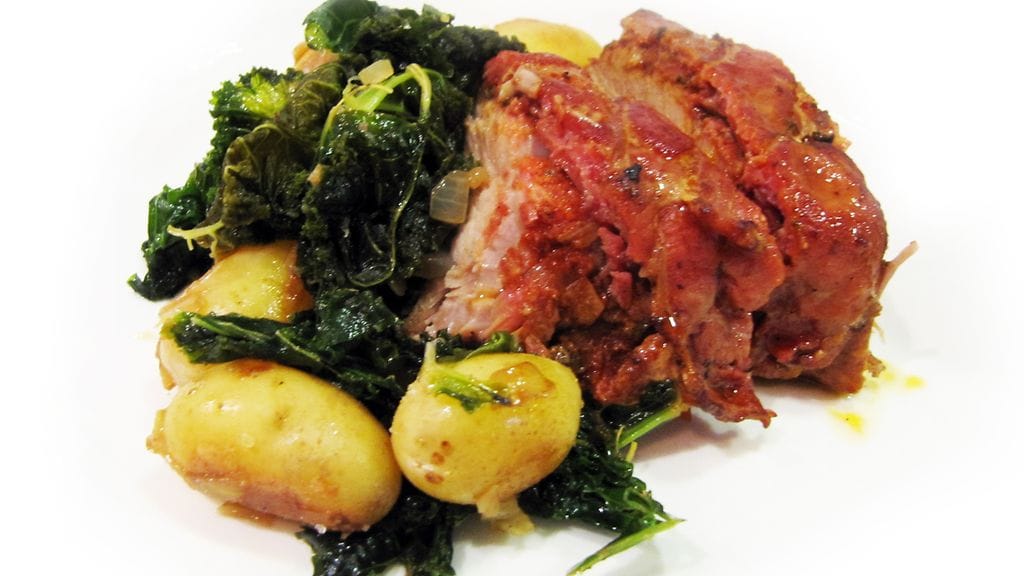 Porsaan kassler eli possunniska kuuluu suosikkiraaka-aineisiini. Se on monikäyttöisyydessään vertaansa vailla. Kesällä se on mehevimpiä grillilihoja ja talvella huikaisevan hyvää hitaasti haudutettuna. Pisimmillään olen kypsytellyt sitä 12 tuntia. Lisäksi sen hinta on hämmentävän edullinen, 8,50 e/kg. Tässä olisi yksi yksinkertaisimmista tavoista valmistaa erinomaista ruokaa. Sen valmistelu vie vartin verran. Uunissa se saa hautua nelisen tuntia. Lisukkeeksi toimivat syksyisin juurekset. Itse tein oman maan peruna-lehtikaalipaistosta.