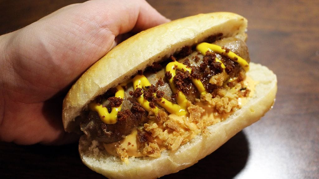 Paistetusta pekonista tehosekoittimella jauhettu "lumi" täydentää kotona tehdyt hot dogit, joita varten sämpylät ja makkarakin kannattaa loihtia omin käsin.