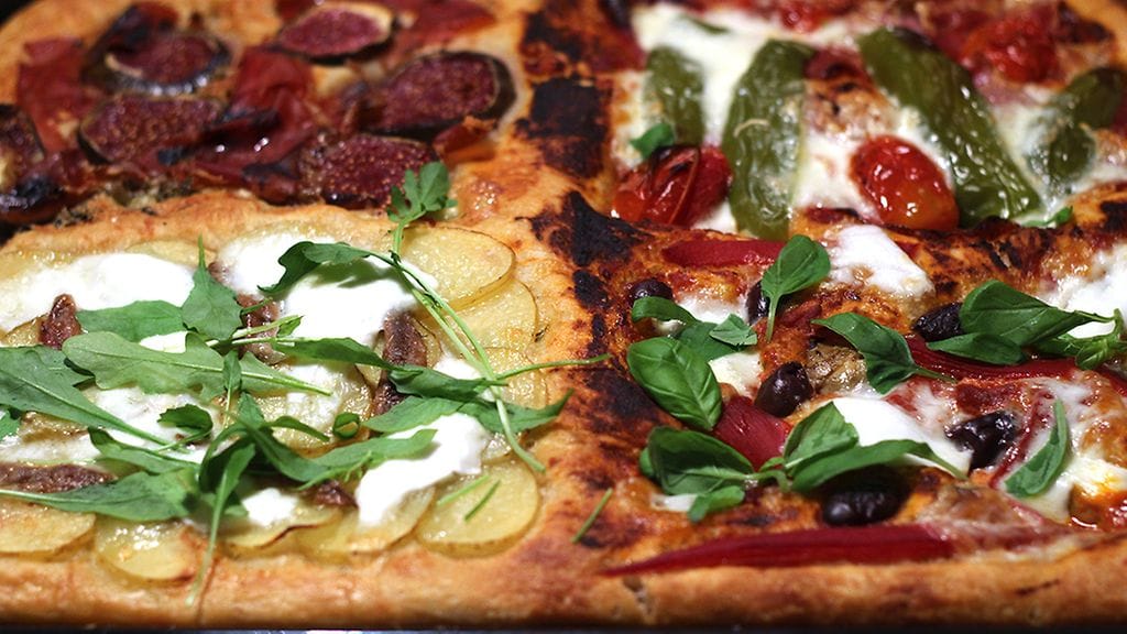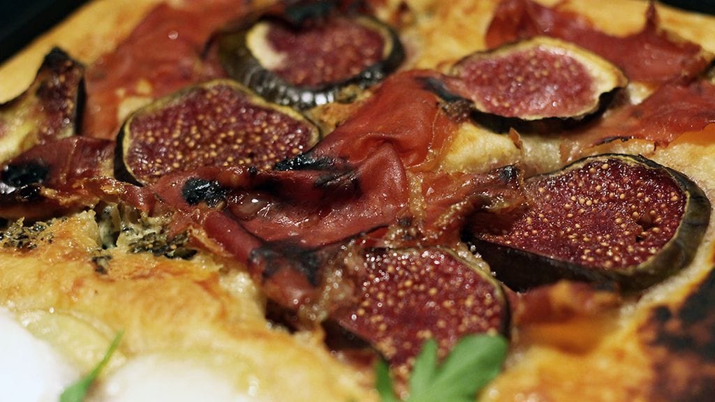 1) sinihomejuusto-parmankinkku-viikuna-balsamico (ei mozzarellaa, tämä on bianco eli myös ilman tomaattikastiketta)