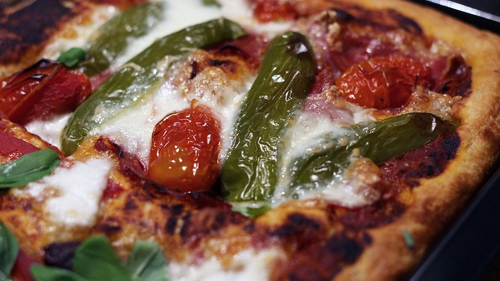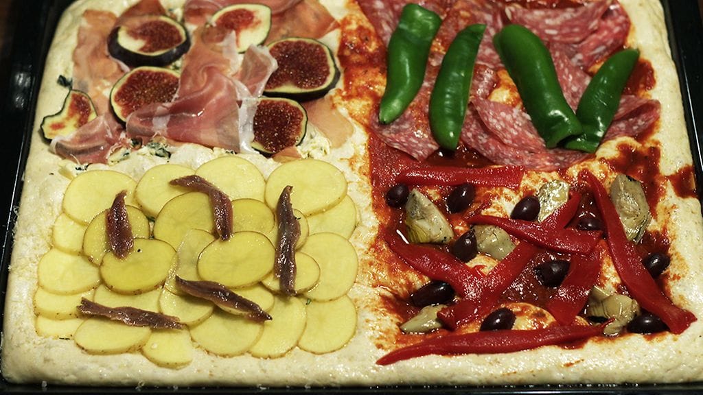 ROOMALAISTYYLINEN PELTIPIZZA eli pizza in teglia kuuluu italialaisiin katuruokaklassikoihin, joita napataan slaissi mukaan ja syödään kädestä, ei ikinä haarukalla ja veitsellä. Tästä on seurannut hämmennystä Suomessa, kun mielestäni maan parasta pizzaa tarjoileva Pizzarium (arvostelu) on noudattanut tätä perinnettä myös meidän kulttuurissa. Halusin löytää tavan tehdä mehevää, paksupohjaista pizzaa ilman pizzauunia. Onnistuin aikas hyvin heti ekalla kerralla. Kohotin taikinaa jääkaapissa yön yli, levitin pellille ja annoin lämmetä huoneenlämpöiseksi samalla yhä kohoten. Taikinaa oli kuitenkin liikaa ja pohjasta tuli turhankin pullea. Alkoi lähestyä focaccia-tasoa. Mutta maku oli silti loistava ja rakenne mehevä ja siksi tohdin postata ohjeen. Seuraavalla kerralla jaan taikinan kahdelle pellille, jolloin kevyempään pohjaan muodostuu helpommin ilmakuplia. Toimii varmasti niinkin. Varmaankin lyhennän paistoaikaa.