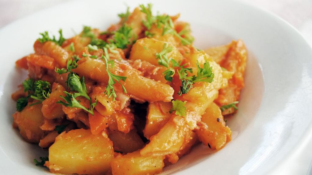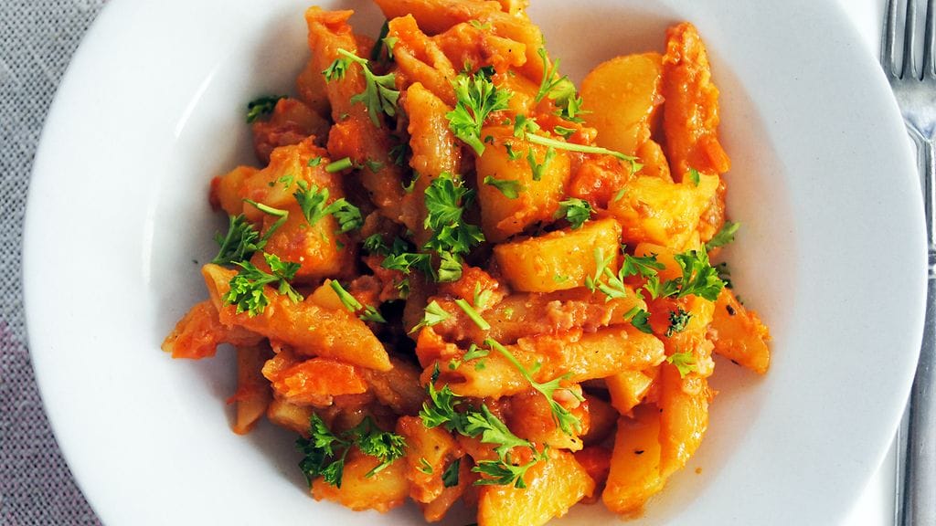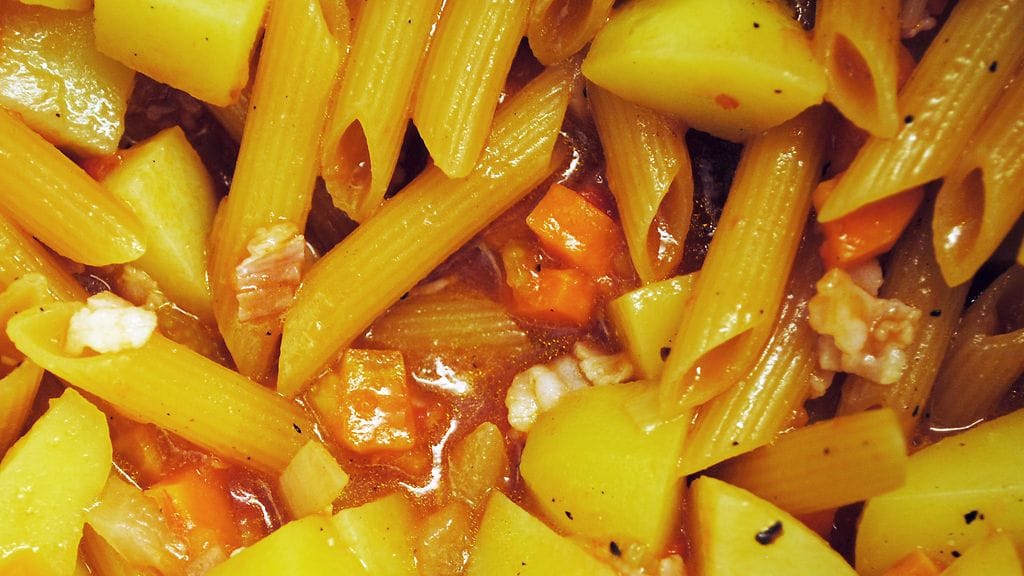 Pasta ja peruna toimivat kimppaan vaikka pelkästään. Eilen mukaan otettiin piristykseksi pestoa ja vihreitä papuja. Nyt tutustutaan italialaiseen versioon pyttipannusta. Ohje on vain viitteellinen. Kuten kunnon spydäriin, voi tähänkin käyttää monenlaisia tähteitä ja saada aikaan uusia makuja joka kerralla.