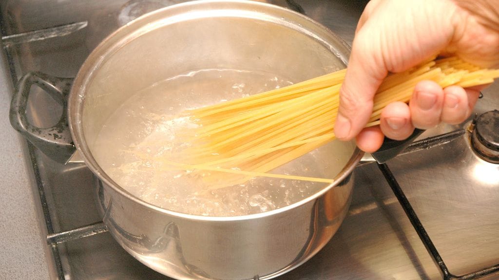 5. Spagetin keittäminen suolavedessä niin, että pasta lisätään jo kylmään veteen