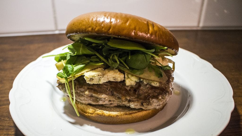 Tässä helppo, nopea ja herkullinen possuburgeri Jamie Oliverilta (hitusen muokattuna). Sinihomejuusto ja makea päärynä ovat klassisen toimiva pari, joten miksei sitä tuotaisi burgeriin mukaan? Toimii erityisen hyvin syyssateiden piiskatessa ikkunaa. Mitä parempaa sinihomejuustoa käytät, sitä parempi burgeri tietenkin tulee.