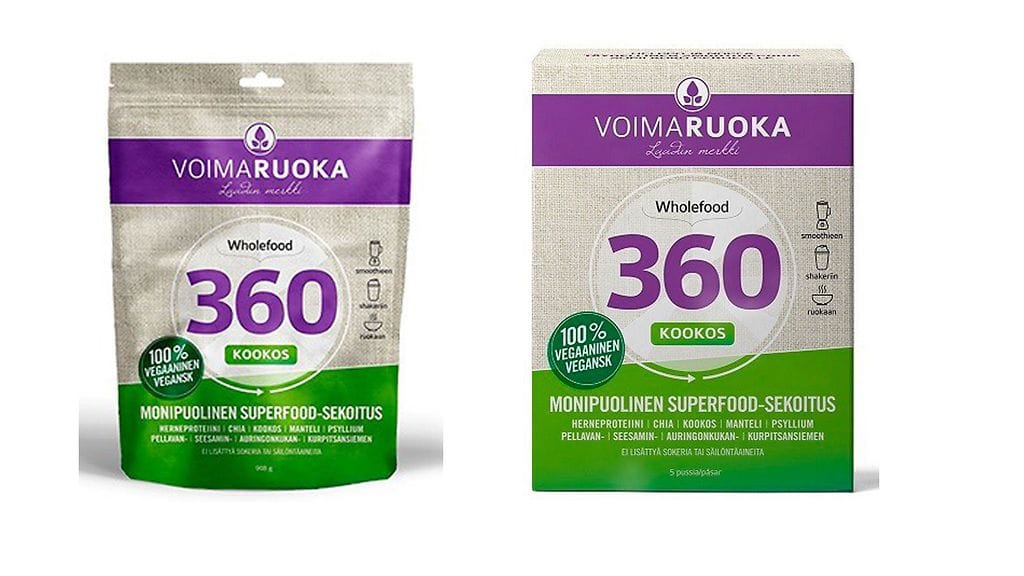 Takaisinvedettävä tuote on nimeltään ”Voimaruoka 360 Wholefood superfood seos, kookos”.
