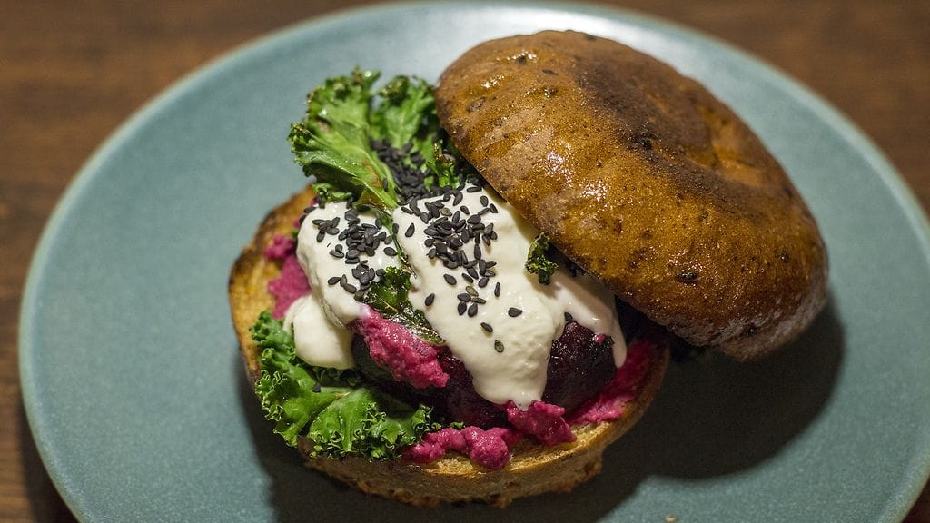 Herkullinen punajuuriburgeri tarjoaa maanläheisiä ja raikkaita sävyjä sekä kasvisburgerille oivan napakkaa rakennetta.