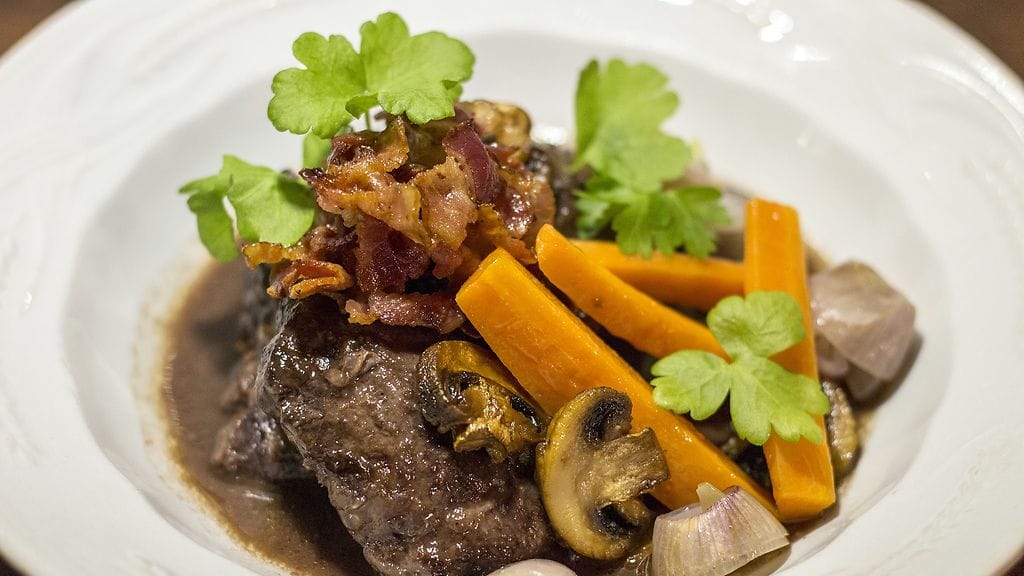 Punaviinissä haudutetut possunposket grand-mère
