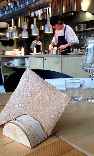 Itse rafla näyttää ulkopuolelta varsin tympeältä, ostoskeskusmaiselta. Sisätilat ovat onneksi tyylikkäät, vaikka seinänkorkuisista ikkunoista aukeava maantie ei kaikkein tunnelmallisin näky olekaan. Ravintola on yllättävän iso halli, jossa pöytien välit ovat tuplat tavalliseen. Meidät ohjataan istumaan ikkunapöytään aivan avokeittiön viereen. Harvoin keittiön toimintaa näkee niin täydellisesti kuin Sinnessä. Palvelu on alusta loppuun sanoisinko perusystävällistä. Persoonatonta, mutta moitteettoman toimivaa. Yhden ruokalajin aterialla meitä palvelee kolme tarjoilijaa.
