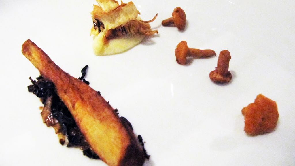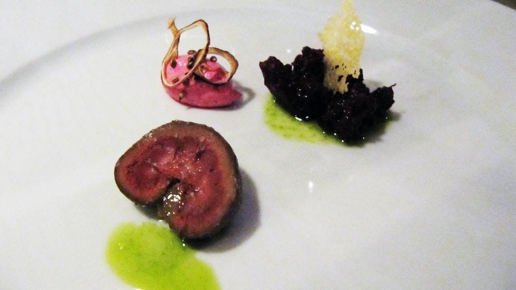 ALKUUN. Huippuhetkiä mahtui iltaan useita. Palvikylki-madeleine oli hauska pieni snacki alkuun haukimurekkeen ja savuperunan seurassa nautittuna. Seuraavaksi sain maistaa ensimmäistä kertaa sulkavaa. Varsin samantyyppinen kokemus kuin särki. Toimii savustettuna fiinilläkin lautasella toisten vahvojen makujen kera. Viskilän tilan maissikukko jatkaa kasvattajan laatulinjaa. Sillä ei voi erehtyä ja käsitys "kanakeitosta" hilautui pari pykälää ylöspäin maanläheisten rustiikkisten makujen saattelemana. Hauskin yllätys oli luomukaritsan munuainen. Yhdessä punajuuren kanssa se toi hienosti hillityn esittelyn turhan unohdetusta raaka-aineesta. Kampasimpukat vasikanluista keitetyssä consommessa jatkoi hienojen ja puhtaiden makujen sarjaa. Consommea olisin voinut hörppiä pitempäänkin. Todella yksinkertaista, mutta tyylikästä. Sahramirisotto lakritsin kera esitteli minulle aivan uuden makuparin, joka iski syvälle tajuntaan ensi haarukallisella. Aloin hahmottaa samalla omaa makuani tarkemmin. Pidän eniten yllättävistä, mutta täydellisistä makupareista ilman sen kummempia kaunisteluja. Välillä upeasti taiteillut annokset lukuisilla elementeillään tylsistyttävät, kun vastaan tulee näinkin simppeli annos, jonka maku pesee hifistelyt mennen tullen. Lakritsi ja sahrami. Muistakaa ne. Kuulette niistä vielä blogissa kotisovellusten muodossa.