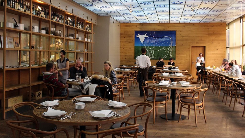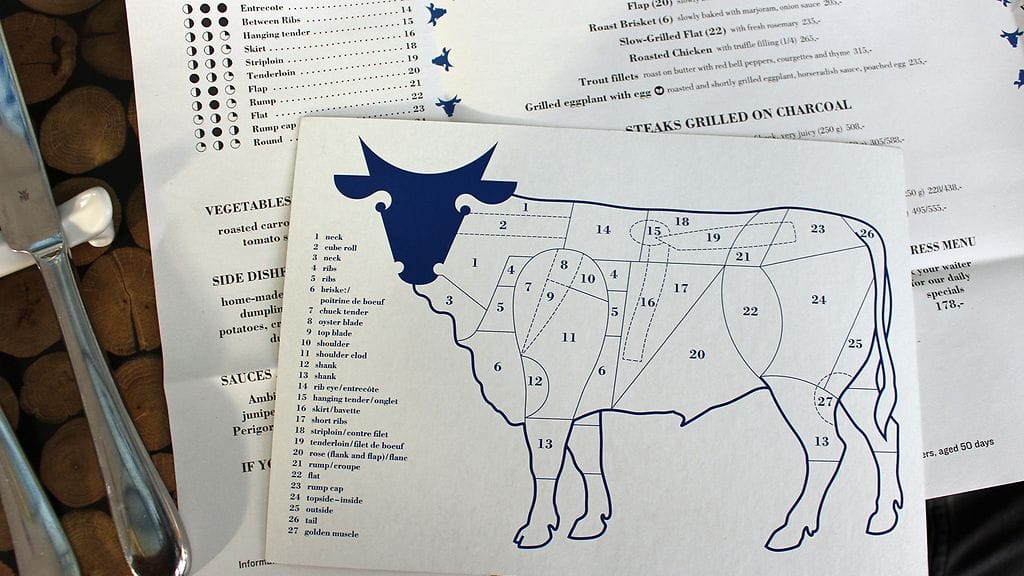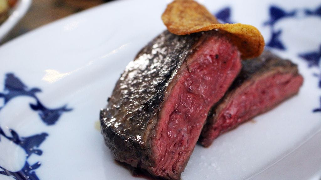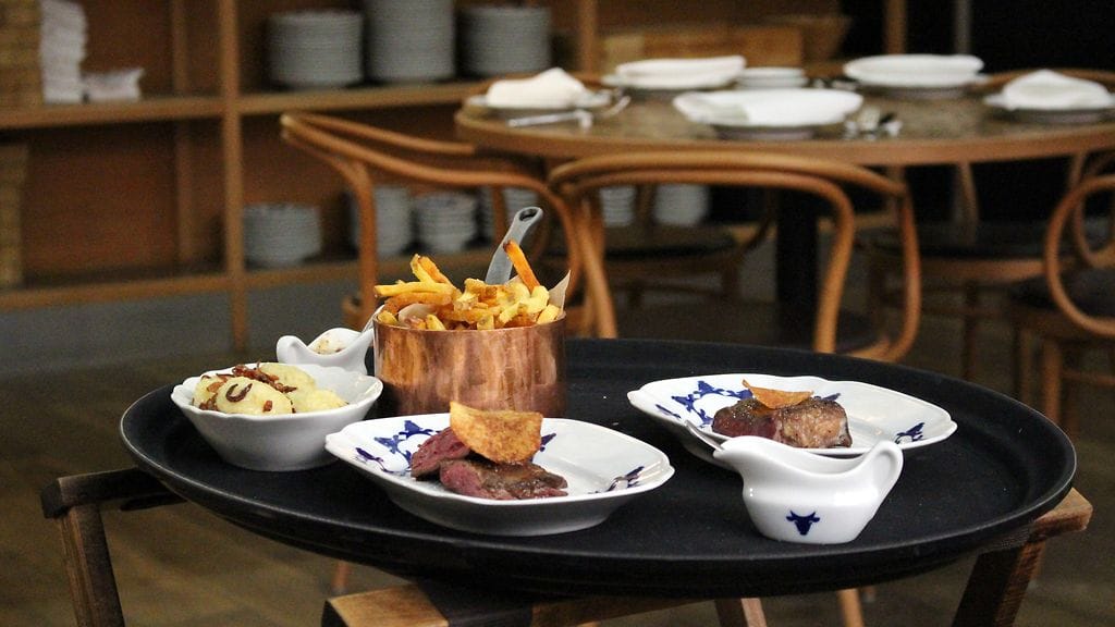 Lasisten seinien sisältä aukeaa suuri, kepeä, puusävyinen tila, jonka näkymää hallitsee avoin keittiö sekä lihanriiputus-/käsittelyhuone. Takaseinällä suuri taulu naudanruhon kymmenistä eri osista. Nyt ollaan lihan ytimessä. Meidät ottaa hoiviinsa hyvin ystävällinen miestarjoilija, joka hoitaa homman kotiin loppuun asti. Nurkassa La Degustationin edellisillan tarjoilijamme heiluttavat meille.