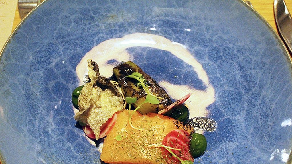 Myrskyä tyynen edellä. Seuraavaksi lautaselle Inarijärven taimenta, hiillostettua kurkkua, savutaimenpyreetä, kalannahkasipsi, purjotuhkavinegretti, kuivattua kurkkupölyä ja pikkelöityä raitajuurta. Pehmeä makumaailma, jonka hienoväritteisyys yllättää edellisen annoksen tykityksen jälkeen. Kaipaa joka tapauksessa suolaa, mutta muutoin kombo asettuu hyvin kasaan. Nahkasipsissä on hitusen liikaa sitkeyttä jäljellä ja maku on muihin osasiin nähden vahva, mutta täydellisissä haarukallisissa kaikki toimii loistavasti. (Kantsii muuten harrastaa niitä, täydellisiä haarukallisia, joissa kerää jokaista komponenttia yhteen suupalaan. Jos se ei toimi, annos ei toimi. Ja kun se toimii… sulje silmät ja nauti.). Mainio annos olisi toiminut vielä paremmin aterian aloittajana.